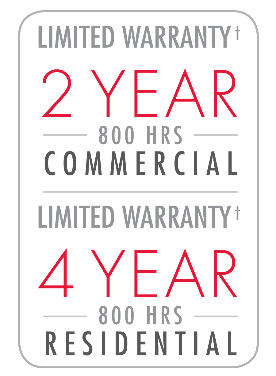 - Utilisation résidentielle : 4 ans ou 800 heures (selon la première de ces éventualités) ; garantie limitée couvrant les pièces et la main-d’œuvre.