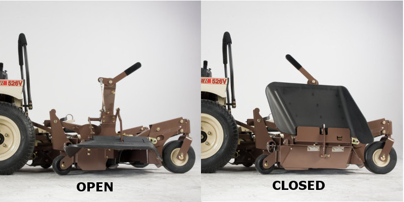- Le système PowerFold® fait pivoter le plateau à presque 90 degrés pour faciliter l’accès au-dessous du plateau afin de simplifier l’entretien et l’installation du kit de mulching, ainsi que la portabilité et le stockage compact.