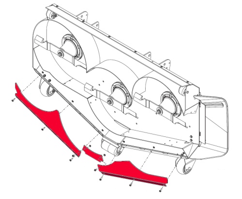 Le kit de protection de l’éjection arrière en option transforme les plateaux de série 34R afin d’orienter les débris vers l’arrière du plateau pour une coupe en douceur et sans andain.