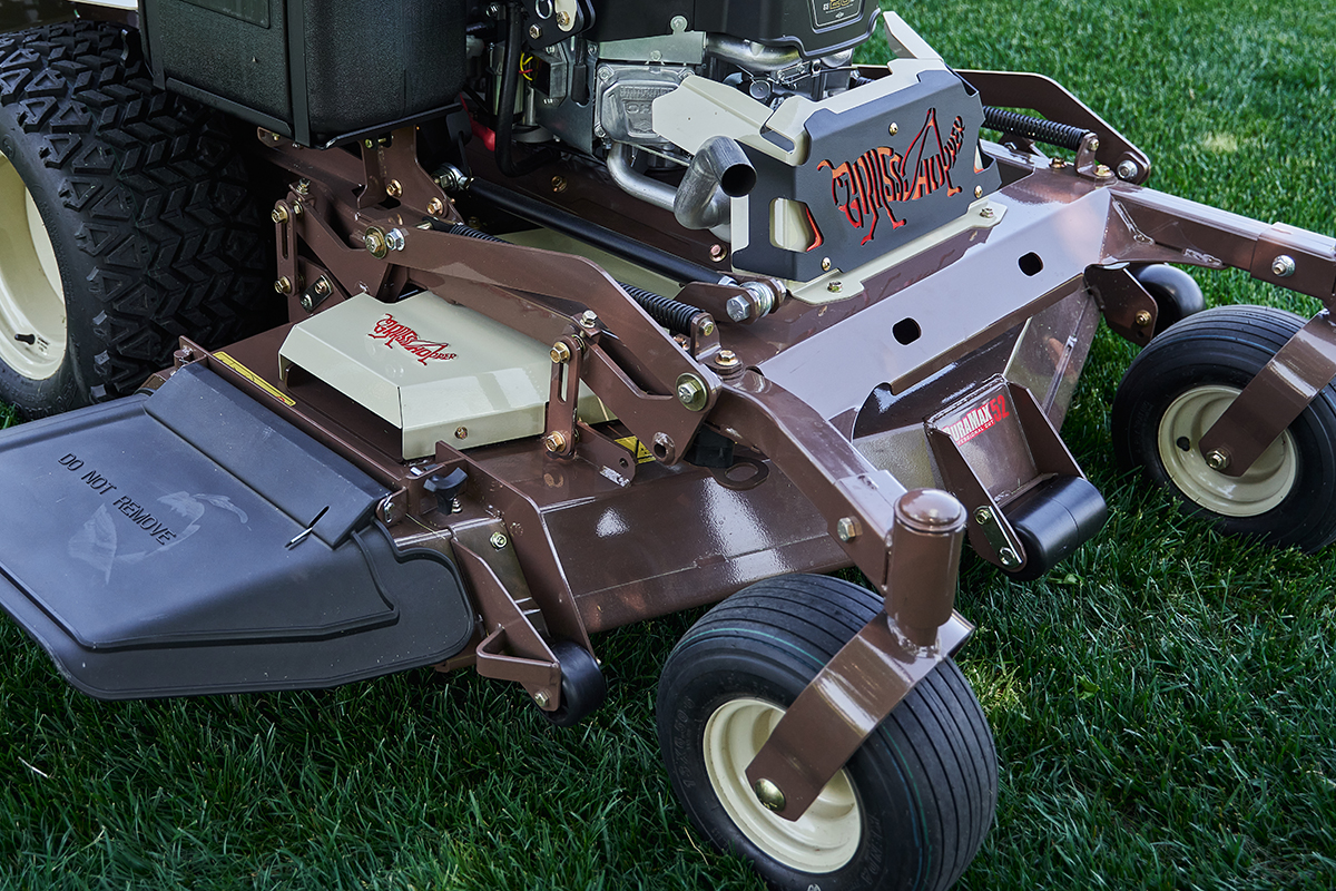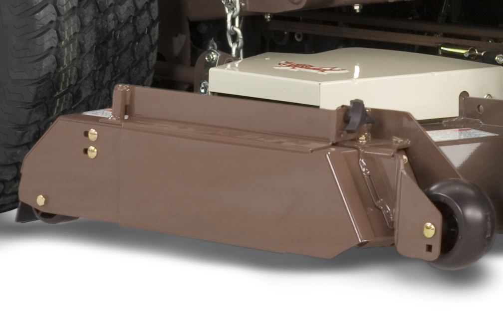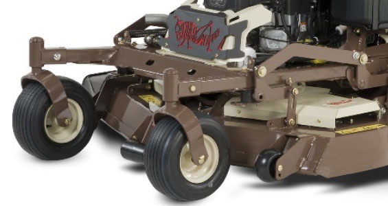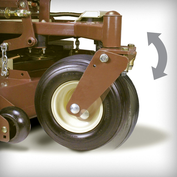 - La conception à roulement centré offre une plus grande capacité de charge pour supporter le poids de l’opérateur, du carburant et du système de ramassage de grande capacité avec une réserve de force pour les amortisseurs de trottoir et les transferts de poids
