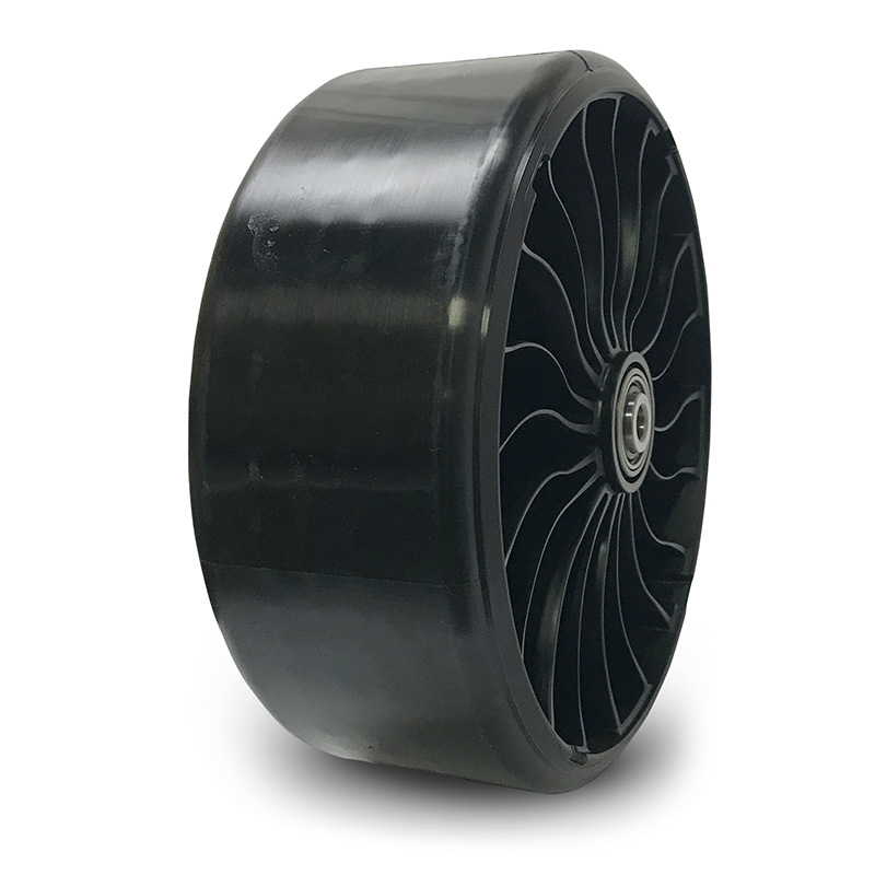 Roue arrière 13x6,50x6 avec bande de roulement lisse. Fonctionne comme un pneumatique, mais sans les inconvénients et les temps d’arrêt associés aux crevaisons. Également disponible pour les roues de plateau de 183 cm.
