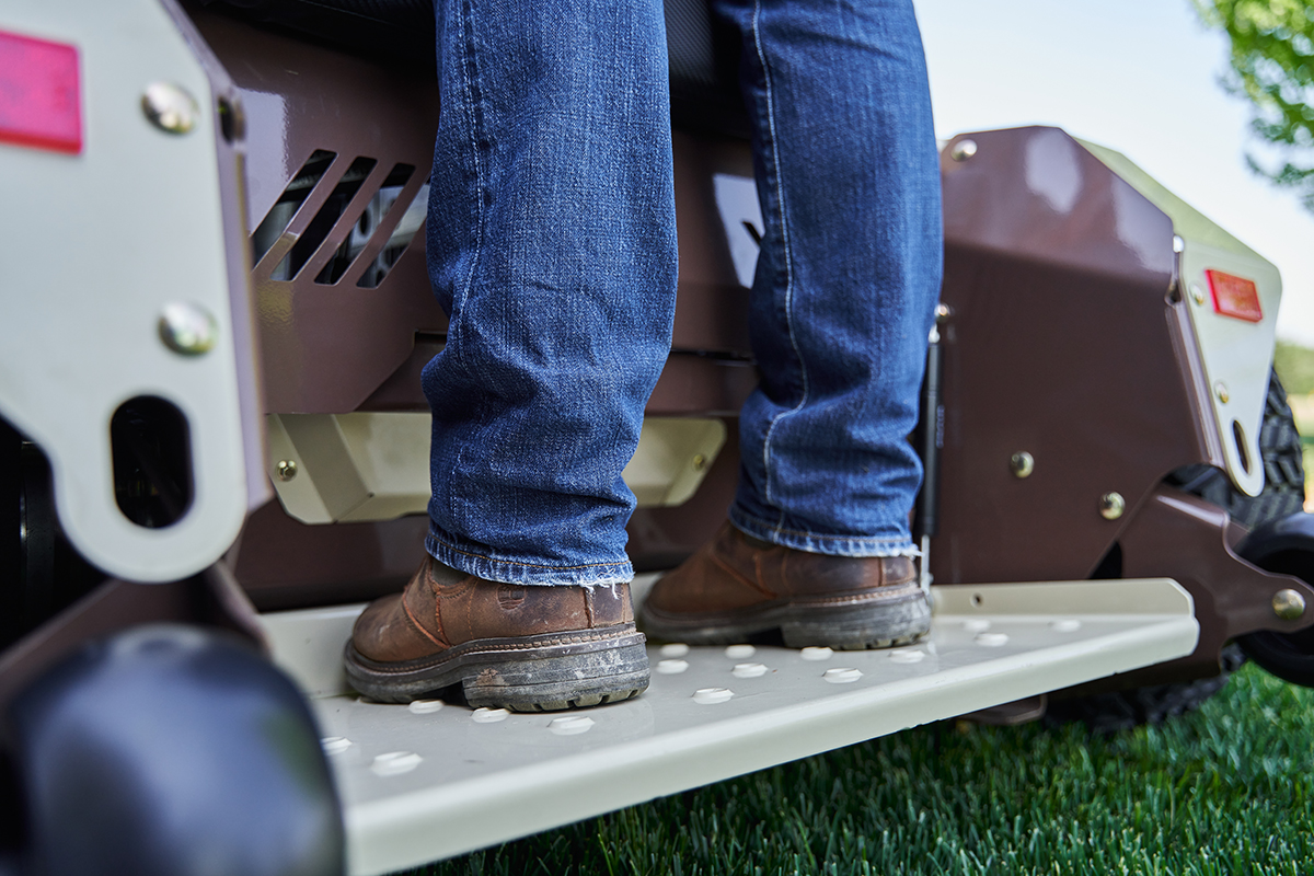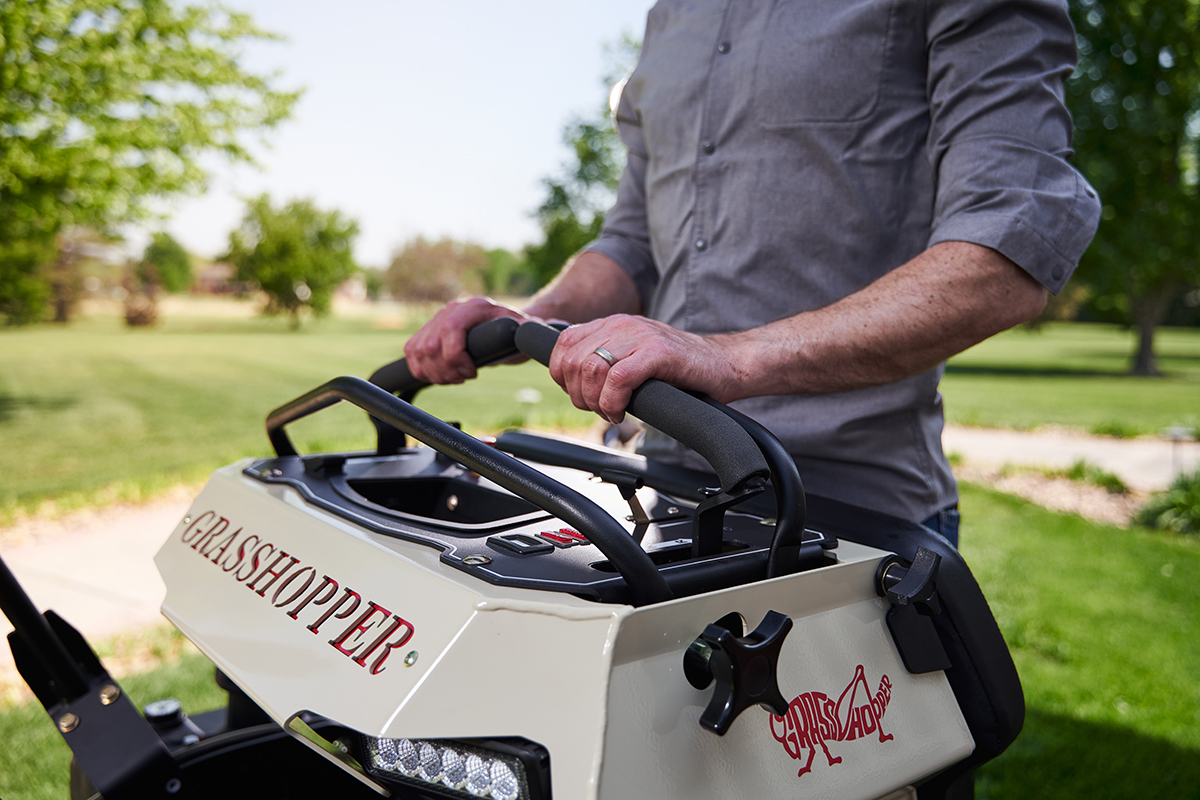 Chaque tondeuse Grasshopper est conçue avec un centre de gravité bas pour une traction et une stabilité optimales. La position centralisée du moteur, la pompe T-Drive™ et les deux réservoirs de carburant des modèles Stand-On abaissent le centre de gravité, et la capacité de carburant totale de 35 litres réduit la fréquence des ravitaillements.
